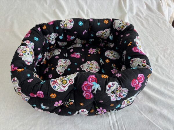Our beds are made from 100% cotton material with polyfill stuffing. They are machine washable and tumble dry on low heat. We recommend tumble dry to fluff them up and then take out and air dry.