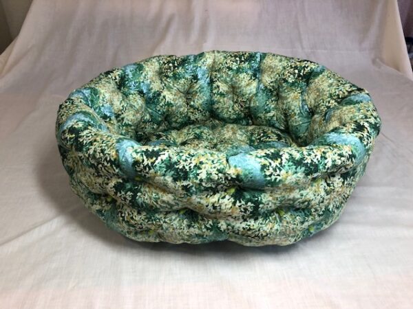 Our beds are made from 100% cotton material with polyfill stuffing. They are machine washable and tumble dry on low heat. We recommend tumble dry to fluff them up and then take out and air dry.